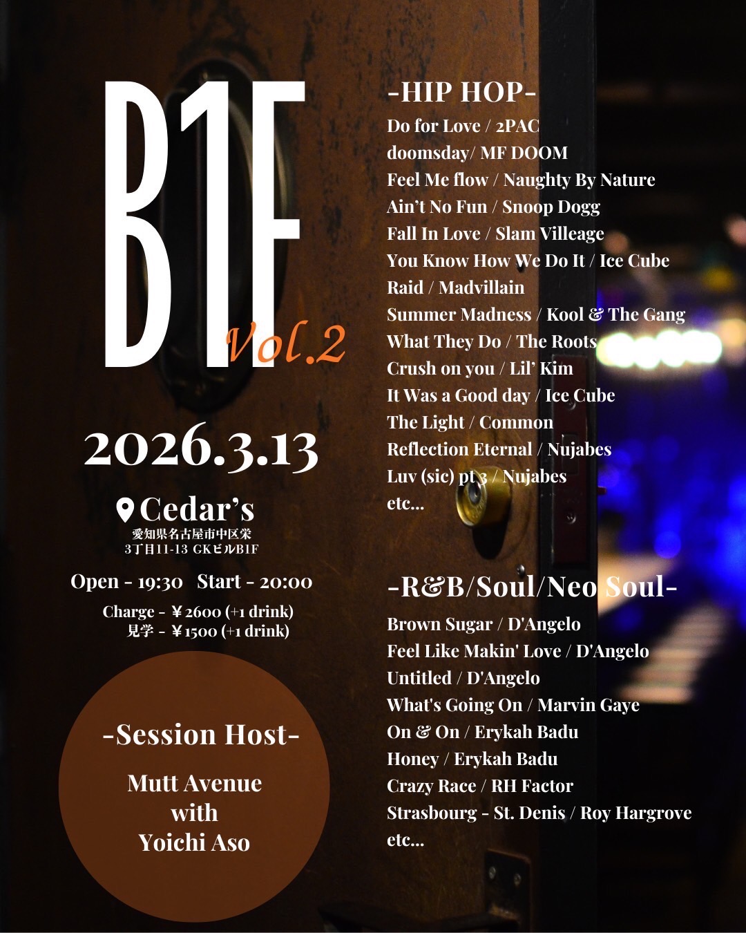 ホーム > 未分類 > B1F session vol.2 公開日:2026/03/13 最終更新日:2026/03/13 -session host- Matt Avenue with Yoichi Aso Open 19:30 Start 20:00 charge 2,000yen(drink別) 見学 1,500yen(drink別) 未分類